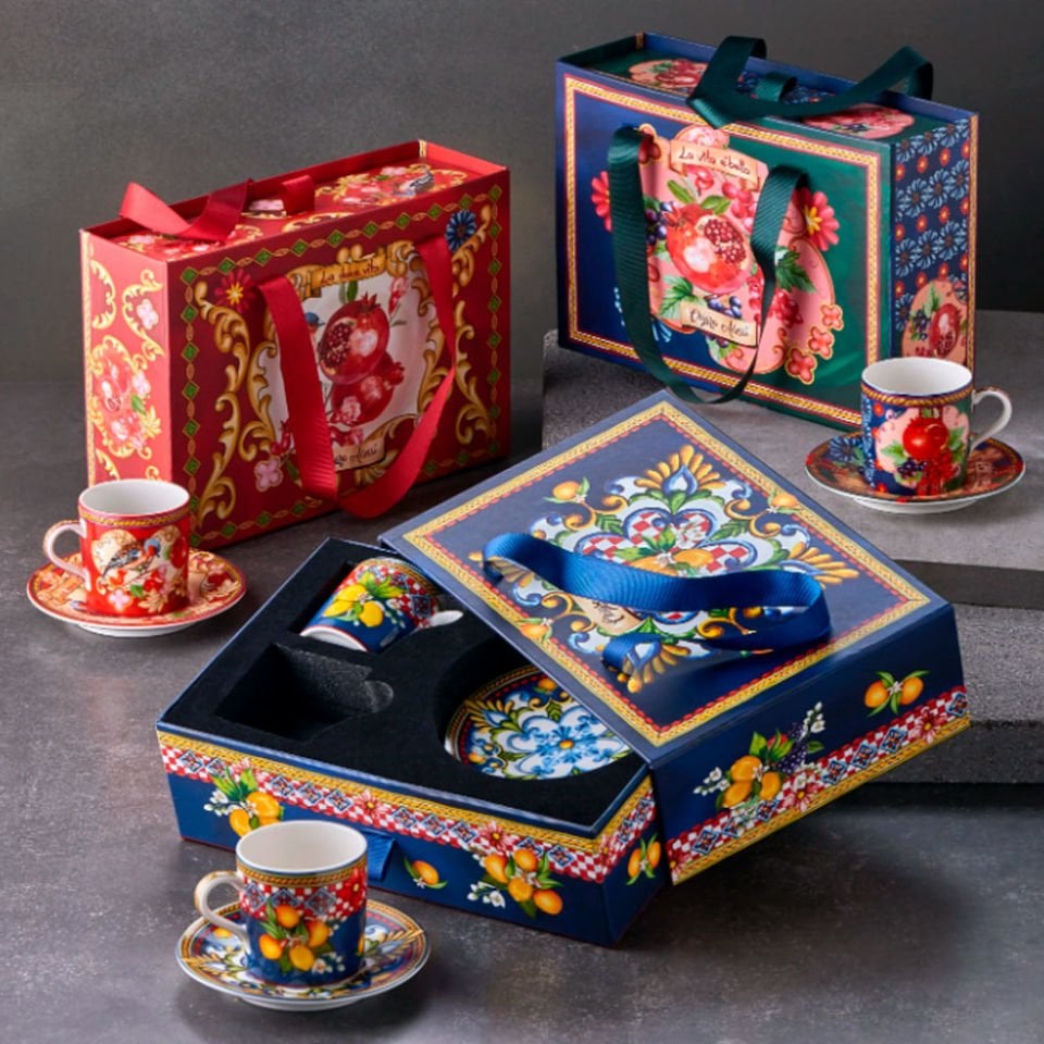 Chiara Alessi La Felicita Türk Kahvesi Fincanı ile kendinizi limon bahçelerinde hissedeceksiniz. Limonun ferahlığından ilham alınarak ortaya çıkan tasarım, sofralarınızda yerini almaya hazır. Mavinin ağırlıkta olduğu renkli zemin üzerinde limon desenleri dikkatleri üzerine çekecek, sunumlarınıza canlı bir hava katacak. İkili fincan seti, şık kutusuyla sevdikerlerinizin mutlu edecek harika bir hediye seçeneğidir.